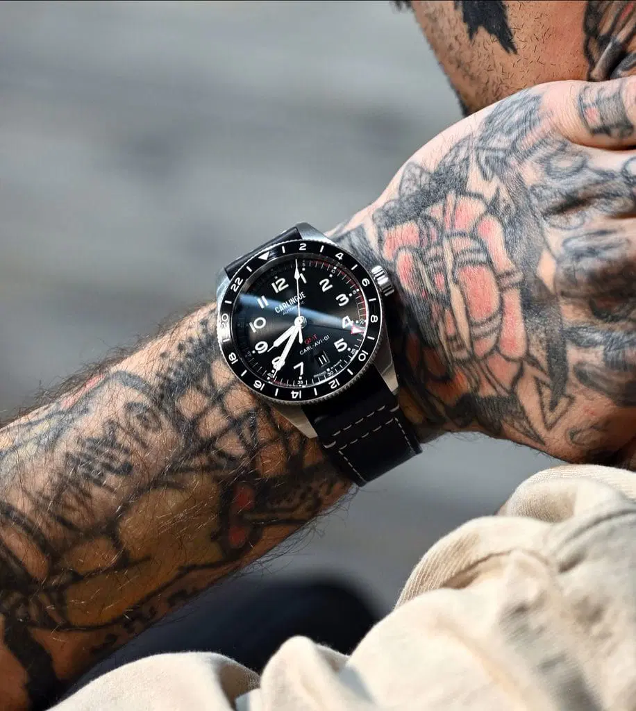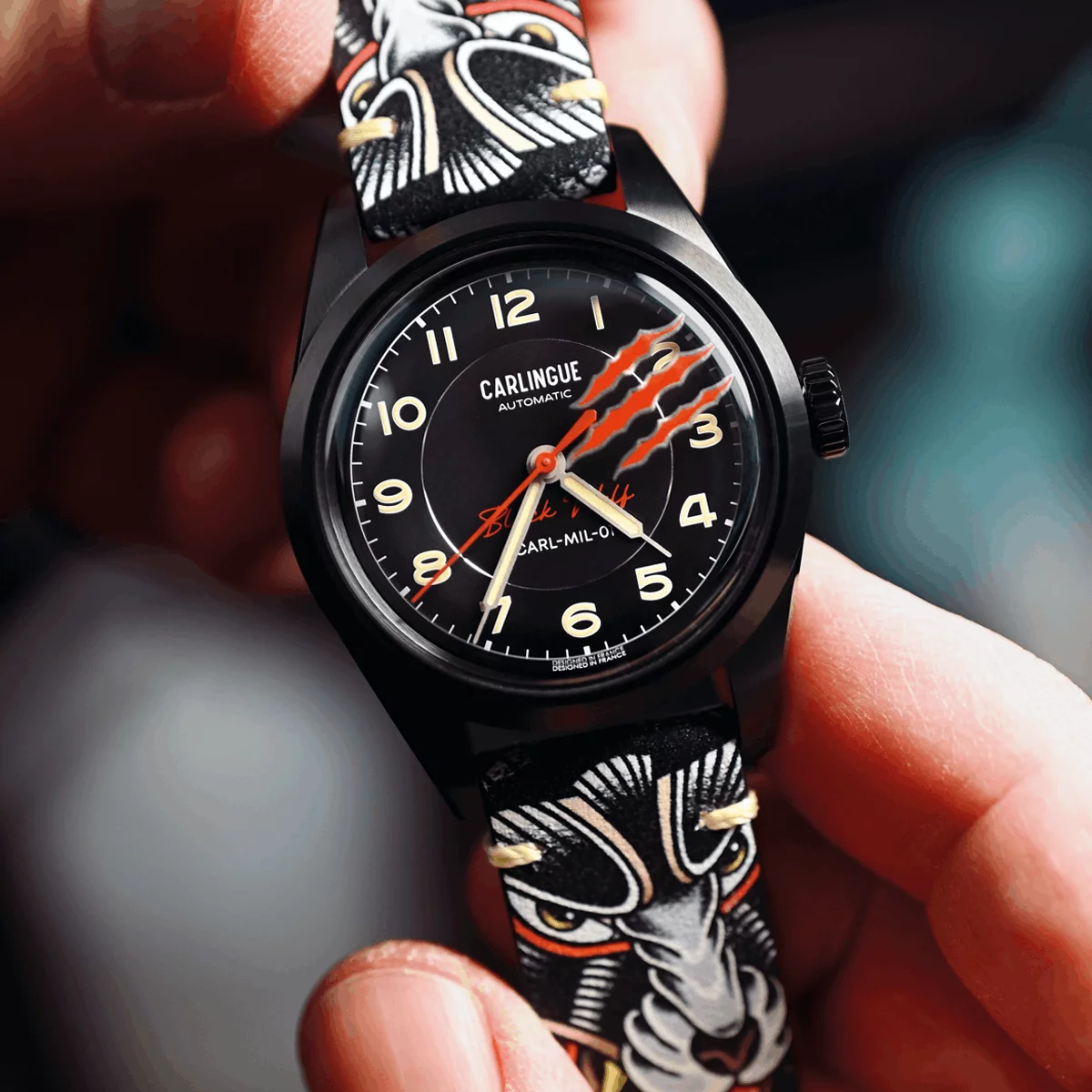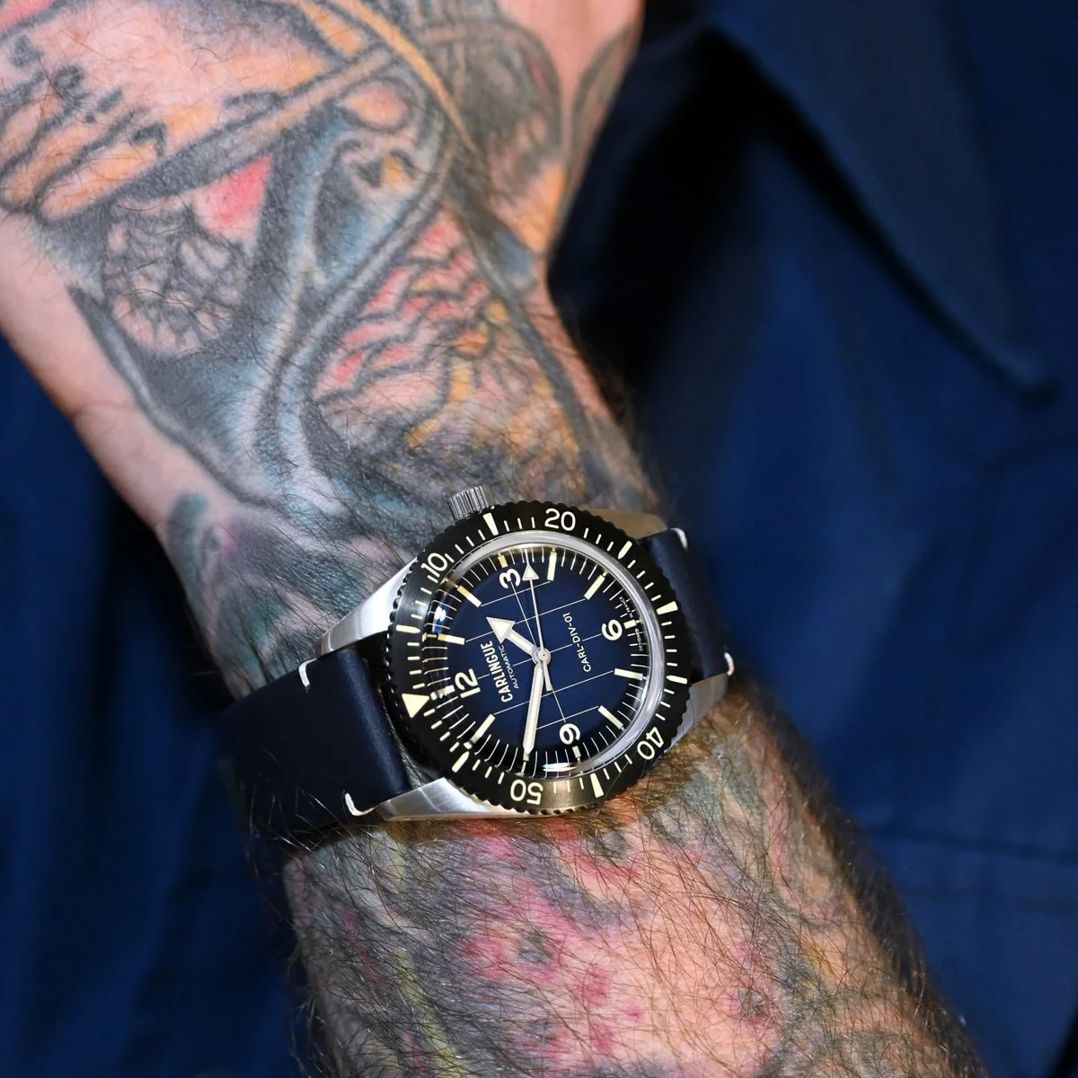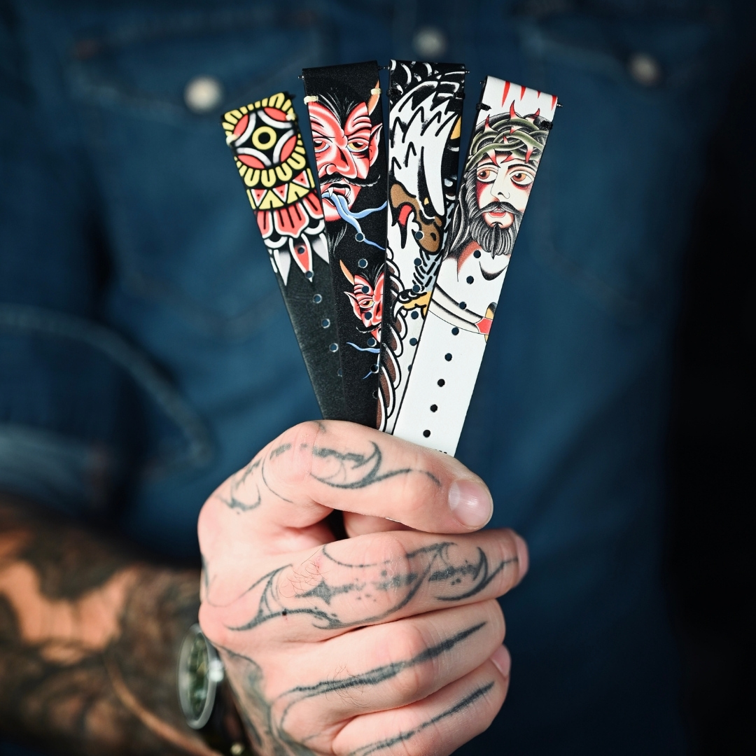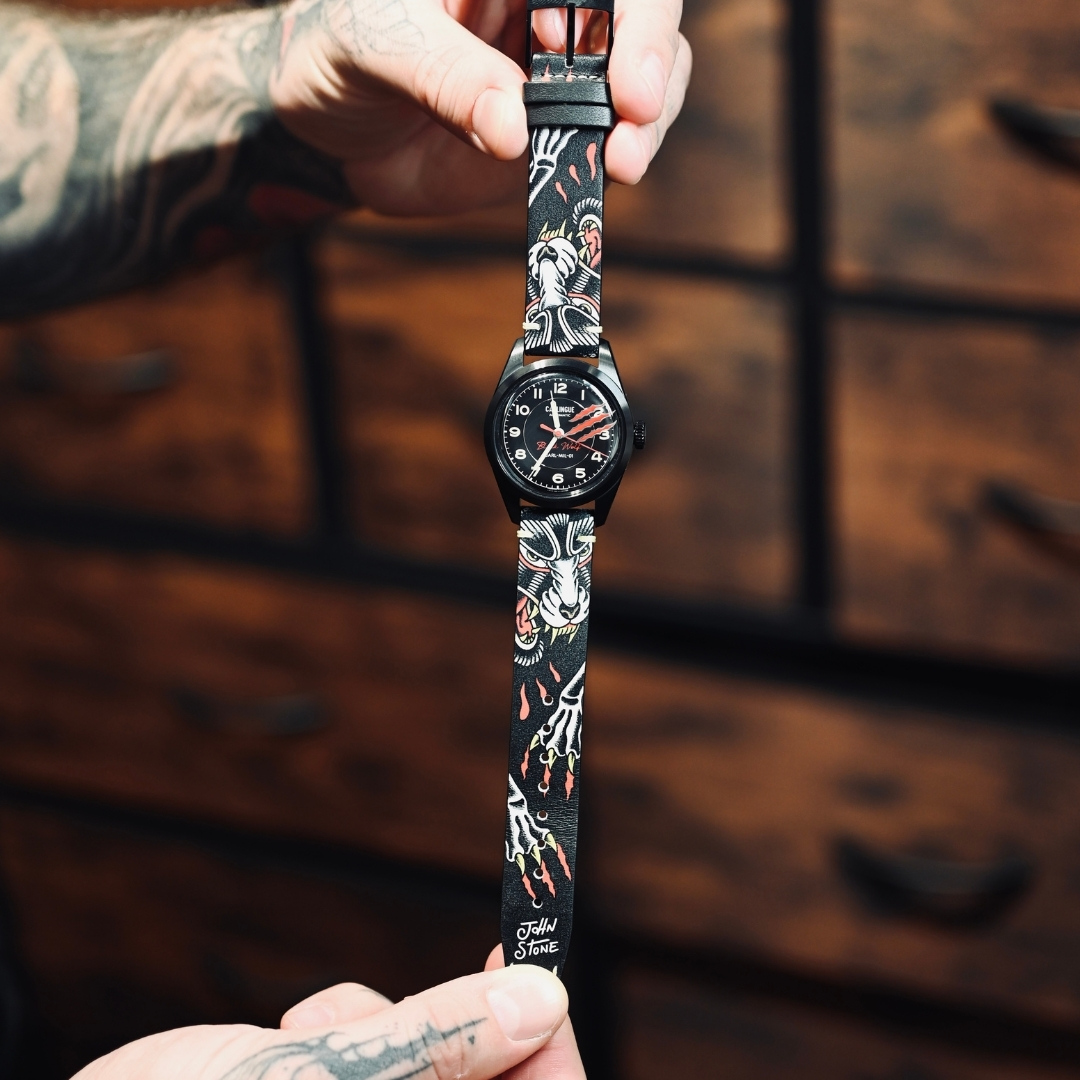 CARLINGUE fait dialoguer ces deux univers : l’horlogerie militaire et l’art du tatouage traditionnel. Nos bracelets exclusifs, imprimés en HD sur cuir pleine fleur et co-créés avec des artistes tatoueurs de renom, transposent cet héritage à même la matière.