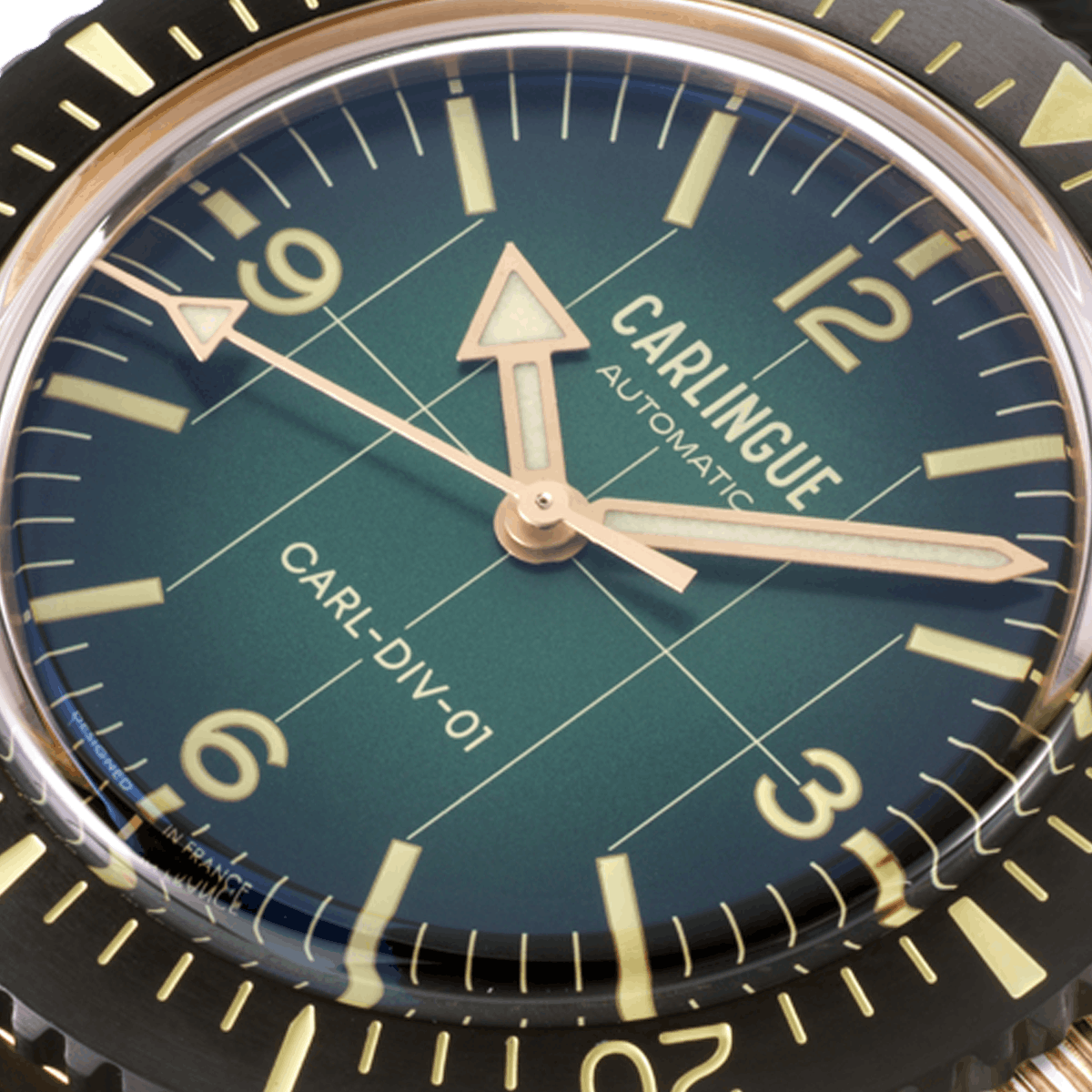 Les chiffres arabes peints et les index appliqués sont traités au Swiss Super-LumiNova®, un matériau luminescent de référence dans l’horlogerie haut de gamme. L’assurance d’une lisibilité optimale, de jour comme dans l’obscurité des fonds marins. Pensée et développée sur la base du cahier des charges des véritables montres de plongée, la Carlingue Diver 01 conjugue robustesse technique, élégance vintage et confort au quotidien, pour accompagner les esprits libres aussi bien sous l’eau que dans la vie de tous les jours.